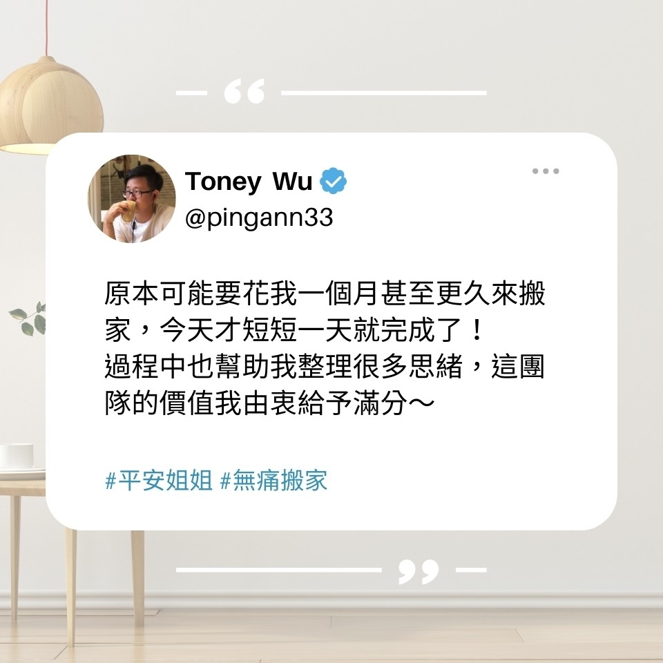 搬家是人生的轉折點,我們的無痛搬家服務讓這個過程變得輕鬆而美好。讓您無後顧之憂,專注於新開始的每一個期待。立即預約,讓您的新生活展翅高飛!