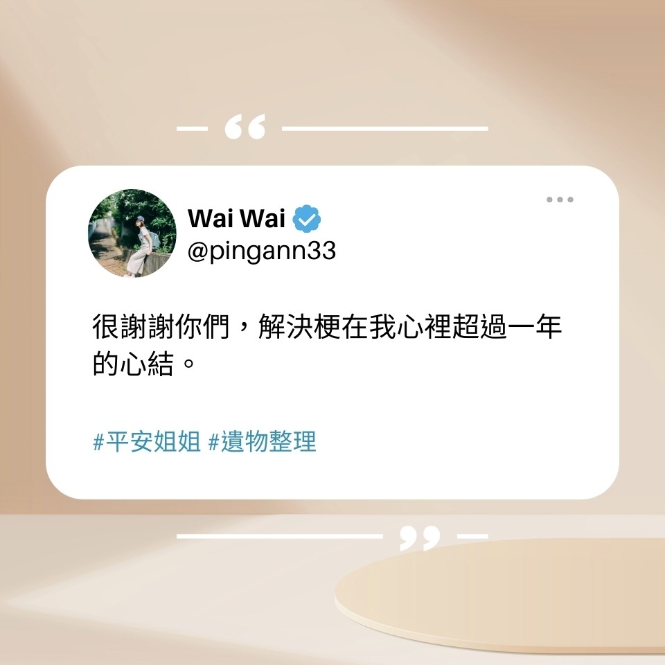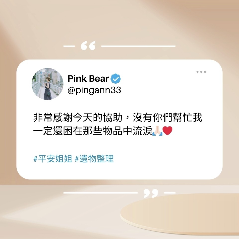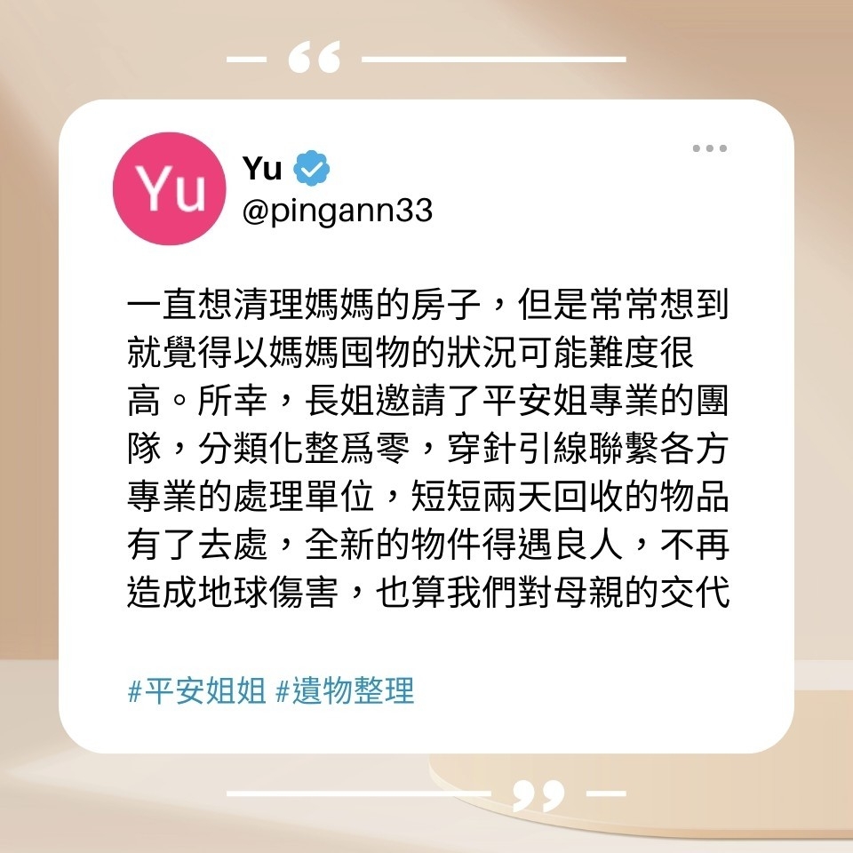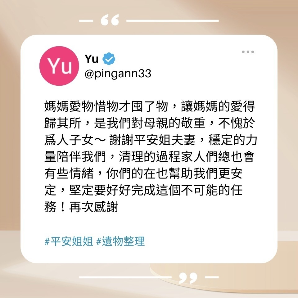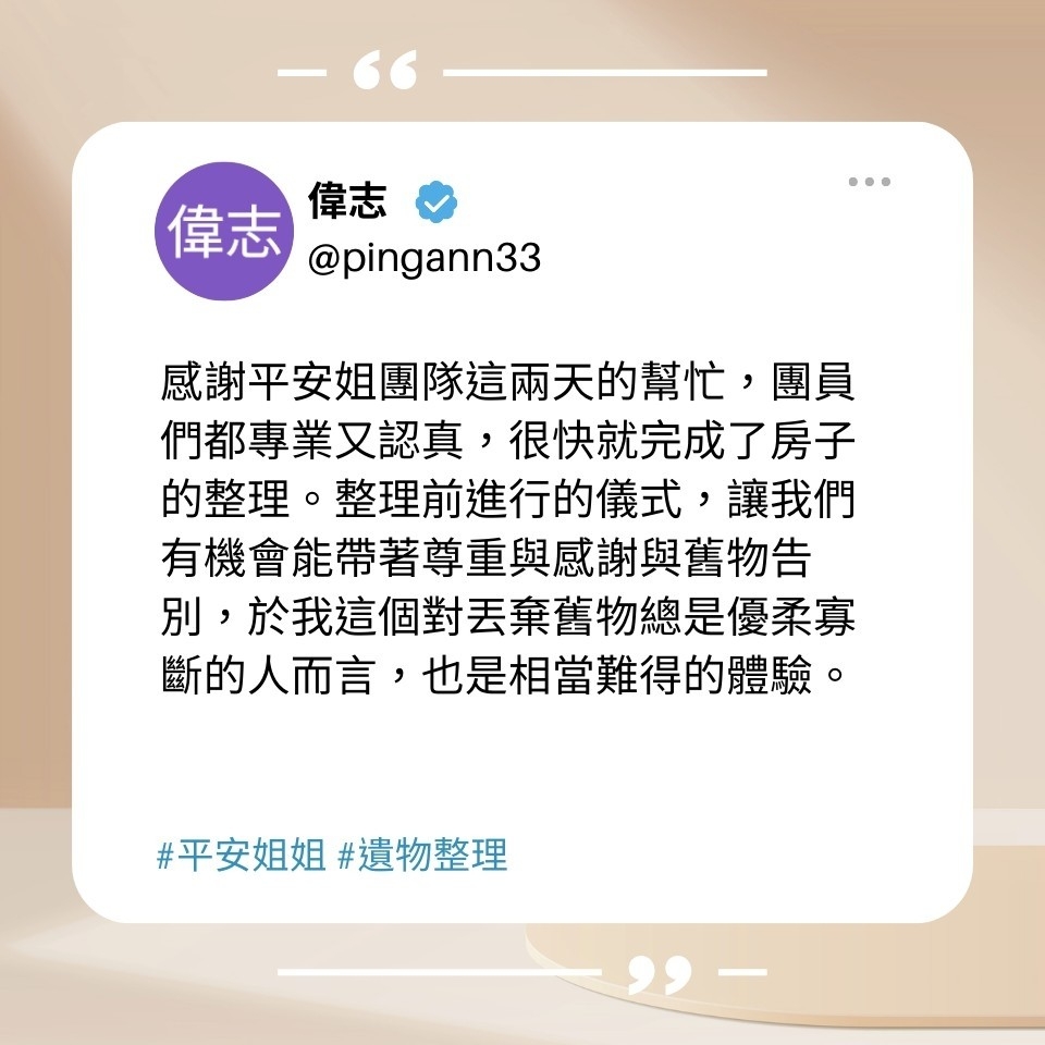 在面對過去的時候,讓我們的遺物整理服務陪伴您走過這段心靈旅程。每一件物品都是一段故事,讓我們一起珍藏回憶,重拾勇氣與愛。隨時預約,讓心靈得到釋放!