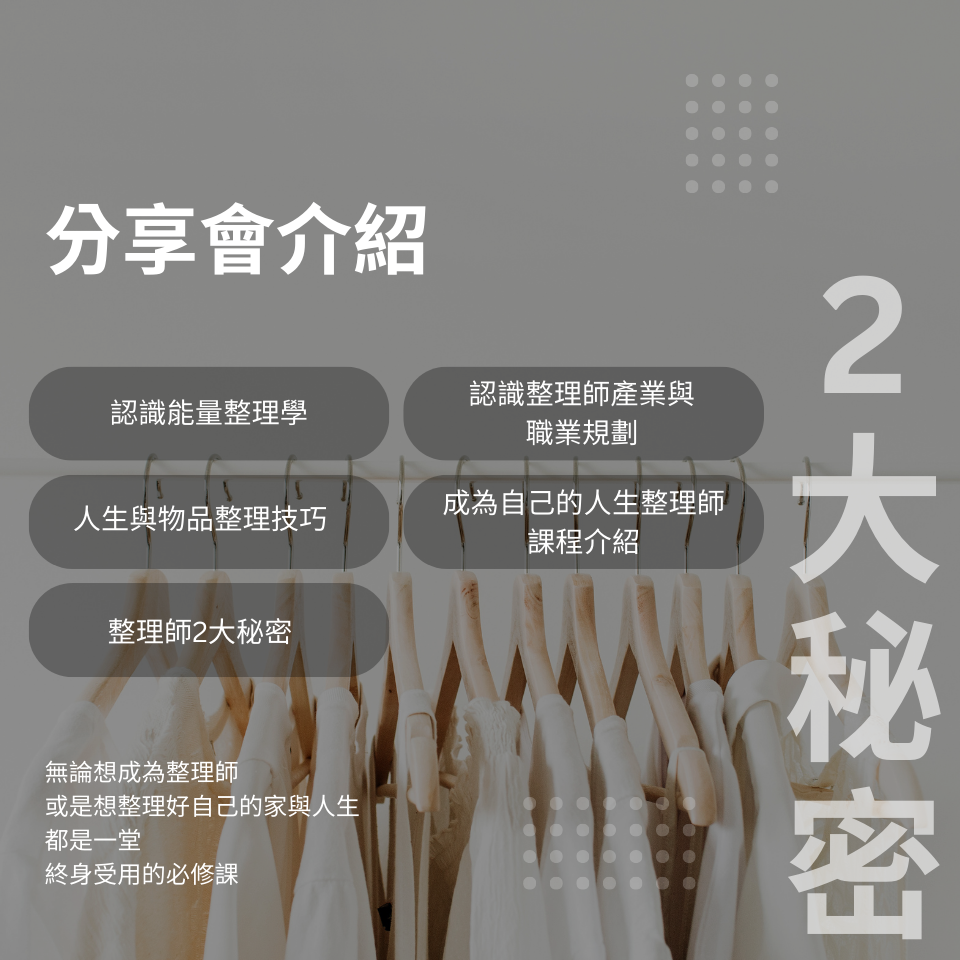 這場分享會將讓您初步掌握整理的力量,啟發全新的生活視角!名額有限,立即報名,與我們一起邁向更有序、更豐盛的生活!