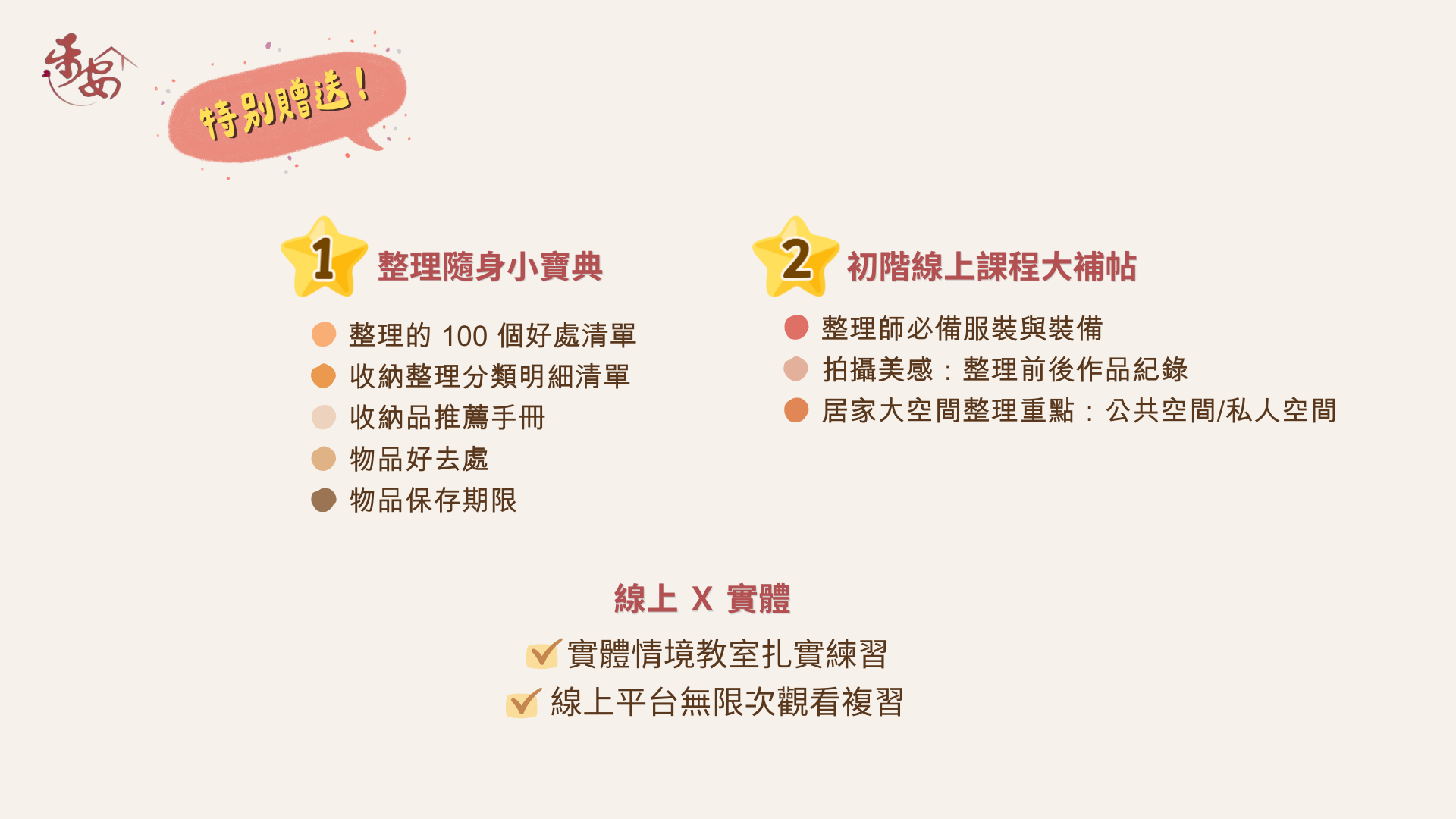 無論您是希望改善自己的生活,還是計劃成為一名專業整理師,這堂課都是您的必修之路!我們更想分享的是,帶您從「內在」的角度出發,與「外在」的空間整理結合,幫助您全面提升生活品質。